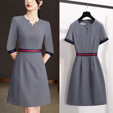 點我下載職業連衣裙2022春夏幼兒園教師園服女幼師A字裙氣質裙美容工作服