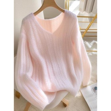 韓系慵懶馬海毛針織衫女秋設計感V領寬松軟糯毛衣高級感溫柔上衣
