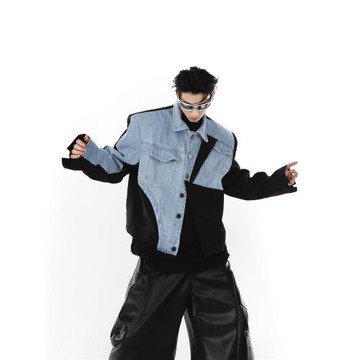 CulturE春季先鋒小眾解構牛仔外套拼料設計感墊肩西服夾克上衣男