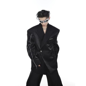 CulturE小眾解構液態流光墊肩廓形西服外套金屬拉鏈設計感西裝男