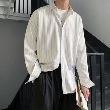 精致抗皺條紋男士寬松長袖襯衫韓版休閑帥氣質港風日系潮文藝外套