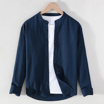 中式立領純亞麻襯衫男長袖休閑復古棉麻襯衣春夏季款圓領防曬外套