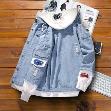 假兩件牛仔外套男春秋新款寬松痞帥韓版夾克休閑帥氣潮牌連帽上衣
