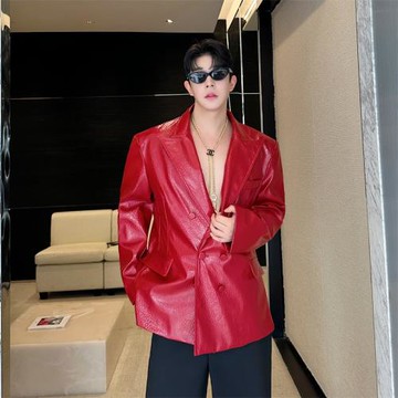 夜店風炸街騷氣紅亮皮西裝男韓版潮牌痞帥百搭鱷魚皮紋理墊肩外套