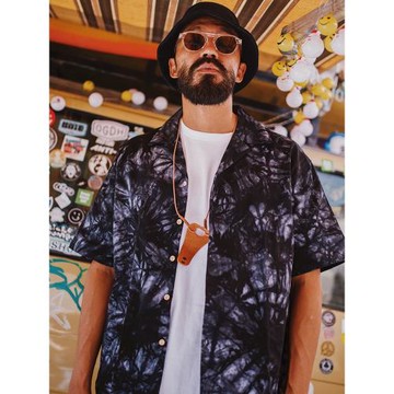 出差夏威夷原創黑色牛仔扎染短袖襯衫外套春夏街頭復古襯衫痞帥新