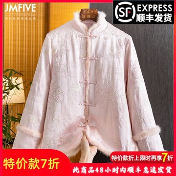 新中式真絲刺繡水貂毛真毛棉服外套女2024冬季新品唐裝保暖棉襖女