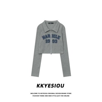 KKyesiou美式學院風拉鏈短款上衣女高腰正肩外穿辣妹bm長袖小外套