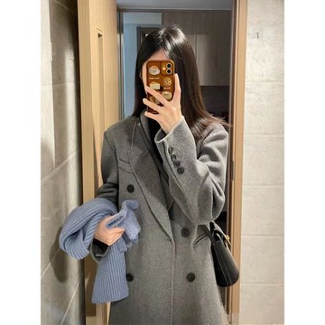 點我下載秋冬季復古高級感灰色顯瘦雙排扣小個子毛呢外套呢子大衣女中長款
