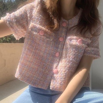 混織金釦短袖外套-粉【KT28751】