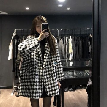 點我下載英倫風西裝領呢子大衣女中長款寬松夾棉加厚千鳥格毛呢外套秋冬季