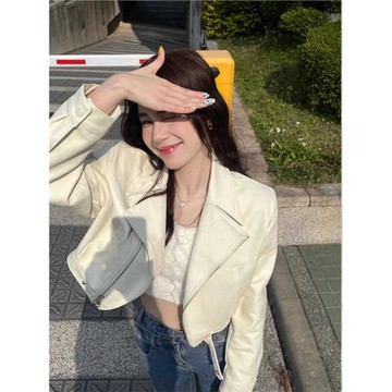 點我下載大翻領白色皮衣外套女2025夏季流行單品小個子PU皮機車服夾克上衣