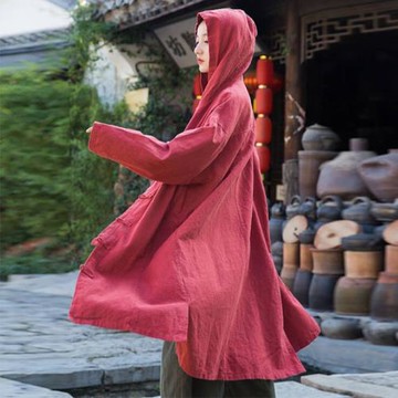 國風風衣女秋新款民族風盤扣復古文藝連帽外套寬松褂子中長款外披