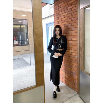 下蛋喵 黑色高級感時髦氣質修身長袖短款小香風外套長半裙套裝女