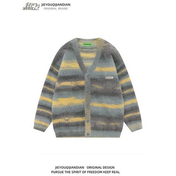 vintage軟糯拼色條紋馬海毛毛衣男女日系復古慵懶V領開衫針織外套