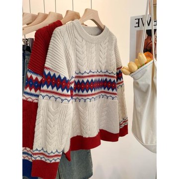(免運)法式撞色費爾島毛衣女冬季麻花圓領套頭針織衫軟糯慵懶寬松上衣厚