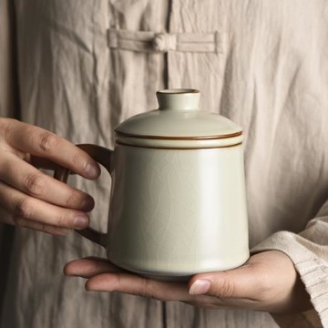 米黃汝窯茶杯陶瓷帶蓋茶水分離泡茶杯茶漏家用過濾開片可養辦公杯