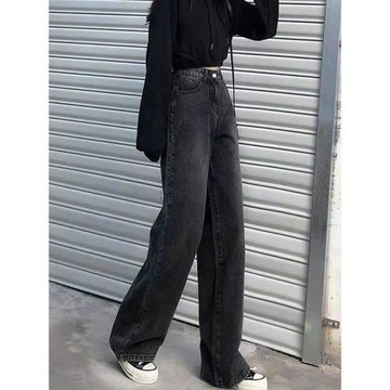 宋正恩黑色直筒牛仔褲女冬季寬松美式高街小個子慵懶闊腿拖地褲