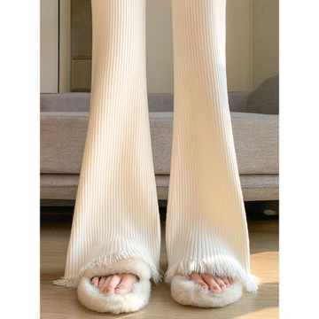 白色加厚軟糯流蘇針織微喇叭褲子女秋冬款高腰顯瘦垂感拖地闊腿褲