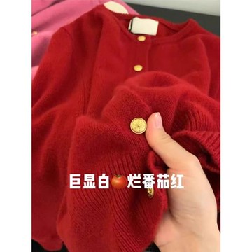 正品哥家新款2025新款女秋裝紅色軟糯圓領針織開衫慵懶風毛衣外套