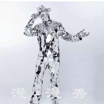 高檔手縫雙面銀色鏡面人演出服厚鏡面亮鉆片反光鏡面人男嘉賓舞