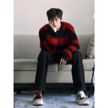 點我下載(免運)紅黑條紋撞色海馬毛毛衣慵懶風高級感針織衫男冬季仿貂毛情侶外套