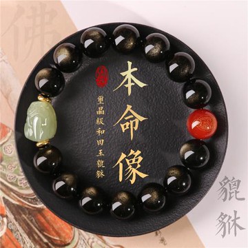 和田玉貔貅手串女男本命年轉運珠黑曜石金曜石佛珠手鏈送男友禮物