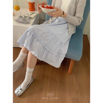 MISS密思家韓版凈版木耳邊A擺中長款半身裙通勤松緊腰顯瘦裙子ins