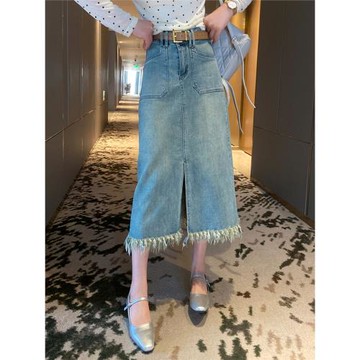 點我下載流蘇開叉牛仔中長裙女2025年春夏新款時尚高腰顯瘦包臀A字半身裙