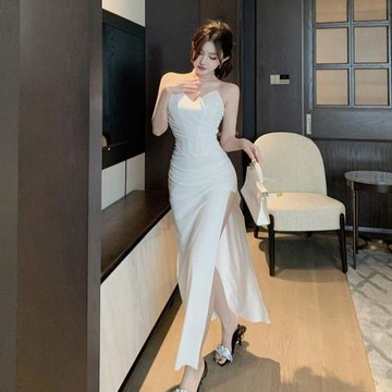韓國fever天絲裙子法式V領無袖修身收腰氣質白色吊帶連衣裙女夏季
