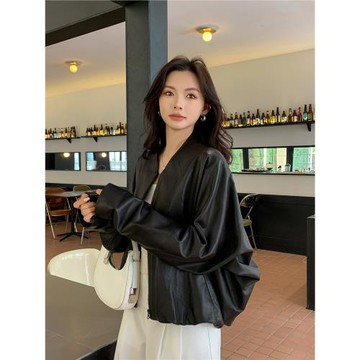 黑色高級感新款真皮皮衣女短款蝙蝠袖綿羊皮夾克外套寬松休閑上衣