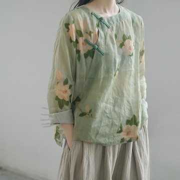 原創新中式斜襟數碼印花苧麻襯衫女復古國風文藝茶服盤扣上衣春夏