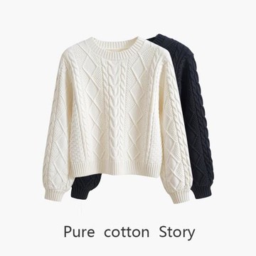 歐單重磅 全棉100% 粗麻花圓領毛衣女士短款寬松套頭針織衫 單穿