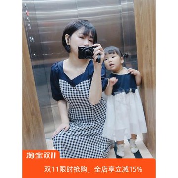 糖皮出品 見字如面 泡泡五分袖 夏季輕薄假兩件藍色格子連衣裙