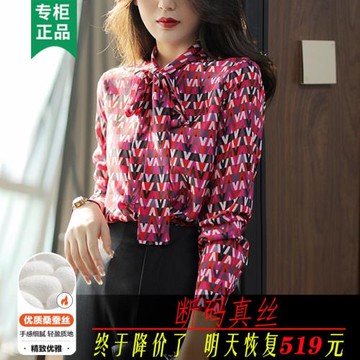 唯品會特賣桑蠶絲印花飄帶大牌襯衫女裝春季法式真絲雙縐長袖上衣