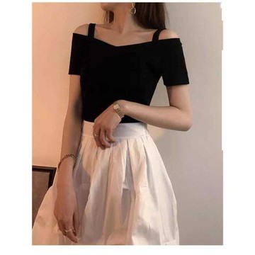 一字肩吊帶黑色短袖T恤女夏露肩百搭性感顯瘦修身設計感上衣鎖骨