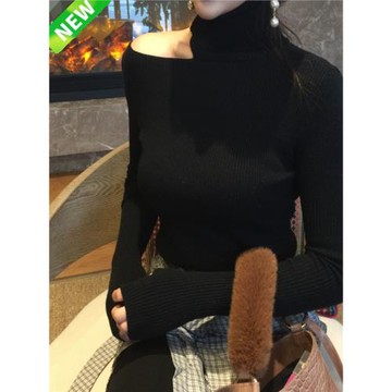 秋冬洋氣設計感針織衫顯瘦毛衣黑色內搭打底衫女高領露肩心機上衣