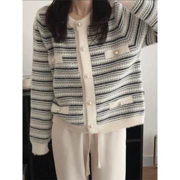 小香風條紋仿貂絨毛衣開衫女2025秋季新款小個子寬松圓領針織外套