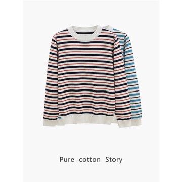重工14針 三色條紋 100%全棉針織打底衫女士薄款套頭毛衣單穿上衣