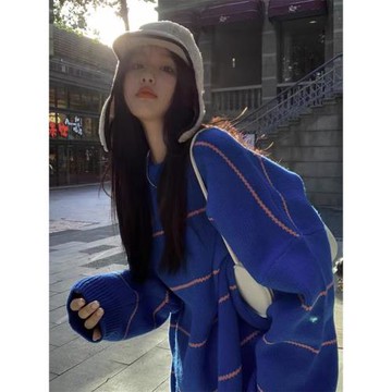 秋冬季高級感克萊因藍溫柔風軟糯套頭毛衣女韓版寬松慵懶風針織衫