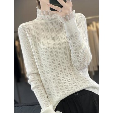 蕾絲木耳花邊長袖針織打底衫女精仿羊毛薄款鏤空鉤花保暖內搭毛衫