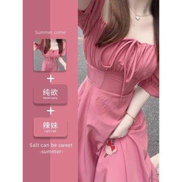 粉色連衣裙子2025新款夏季方領初戀小清新甜美收腰垂墜感長裙仙女