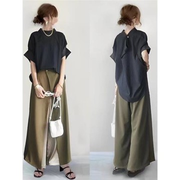 時尚兩件套裝女日系黑色立領蝙蝠袖設計感短袖襯衫上衣拼接闊腿褲