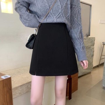 毛呢半身裙冬天配毛衣黑色開叉大碼a字裙女胖mm顯瘦百搭職業短裙