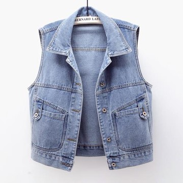 歐貨休閑復古藍貼皮牛仔馬甲女背心春秋新款無袖顯瘦外套坎肩
