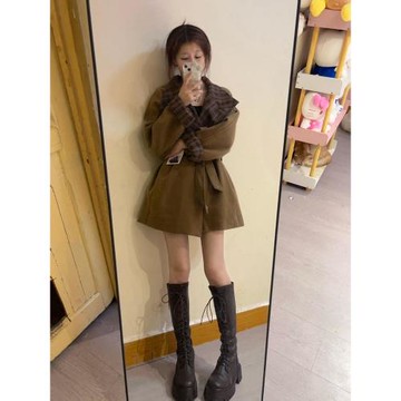 小個子撞色格子立領風衣外套女韓版寬松中長款英倫風咖色大衣秋冬