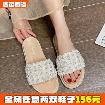 水鉆珍珠厚底涼拖鞋女外穿夏41-43大碼2023新款軟底百搭休閑一字