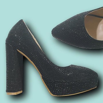 13CM黑色水鉆粗跟單鞋尖頭超高跟鞋防水臺模特走秀時裝鞋不累腳