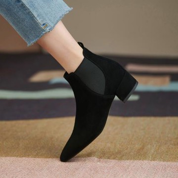 粗跟平底馬丁靴女尖頭真皮磨砂短靴中跟一腳蹬切爾西靴英倫風裸靴