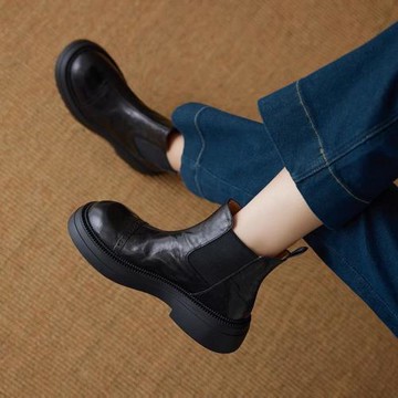 手工真皮厚底切爾西短靴女秋冬新款英倫風圓頭馬丁靴女松糕及踝靴