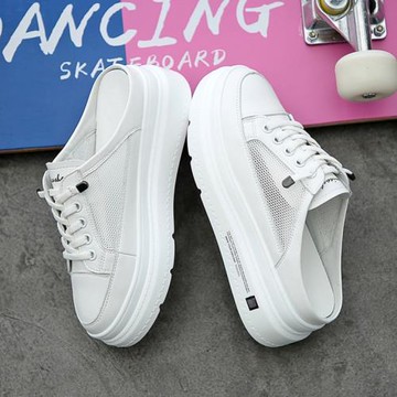 新款半拖小白鞋女厚底夏無后跟休閑鞋內增高小碼真皮涼拖包頭外穿